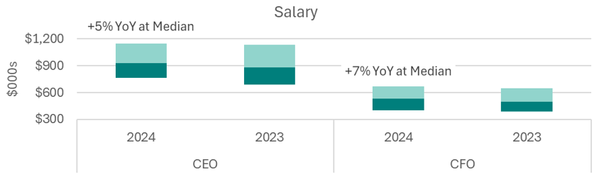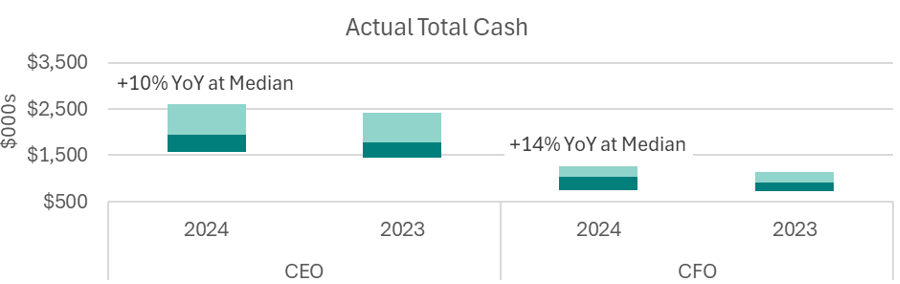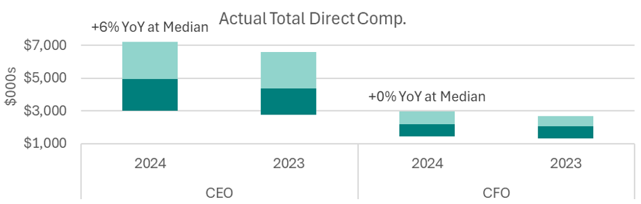 Actual Total Cash Compensation (salary plus actual 2024 bonus) grew strongly for same incumbents, with CEOs growing by 9% at median and CFOs growing by 15%. These trends reflect a continued shift to incentives as the primary driver of compensation increases and higher bonuses on a year-over-year basis.