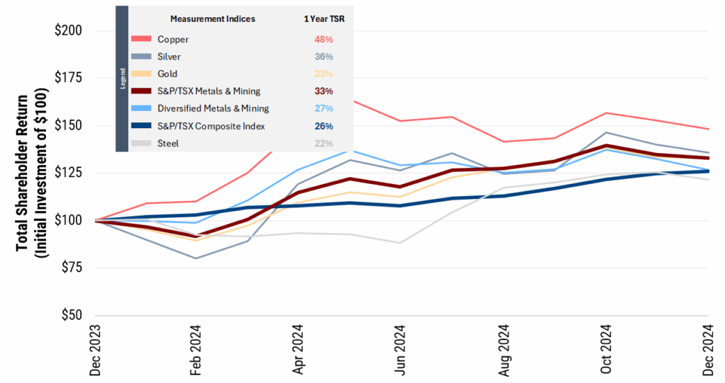 Southlea reviewed the compensation data for the 41 companies in the metals and mining industry sector. The compensation outcomes of 2024 occurred against a backdrop of extremely strong financial and market performance (at median, of companies reviewed):