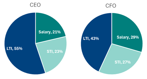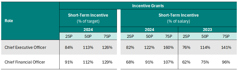 Actual short-term incentive (STI) payouts (as a percentage of salary) increased, at median, from 114% in 2023 to 122% in 2024, while, for the CEO, the median payout was 113% of target.