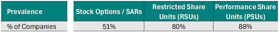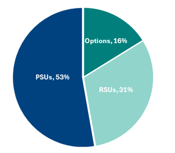 For long-term incentives (LTI), performance share units (PSUs) continue to take center stage, reflecting 53% of the LTI mix, with restricted share units (RSUs) and stock options reflecting the remaining 31% and 16%, respectively.